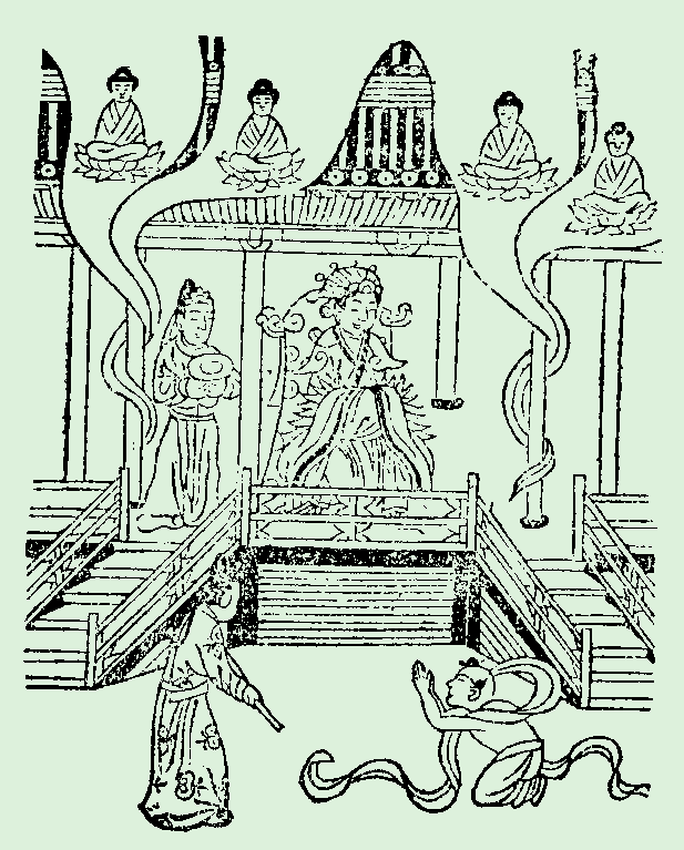 善財童子第四十二詣此世界中 參佛母摩耶聖后 在大樓觀坐寶蓮華 色相端嚴威光顯著 念念佛出生生爲母 得大願智幻生法門